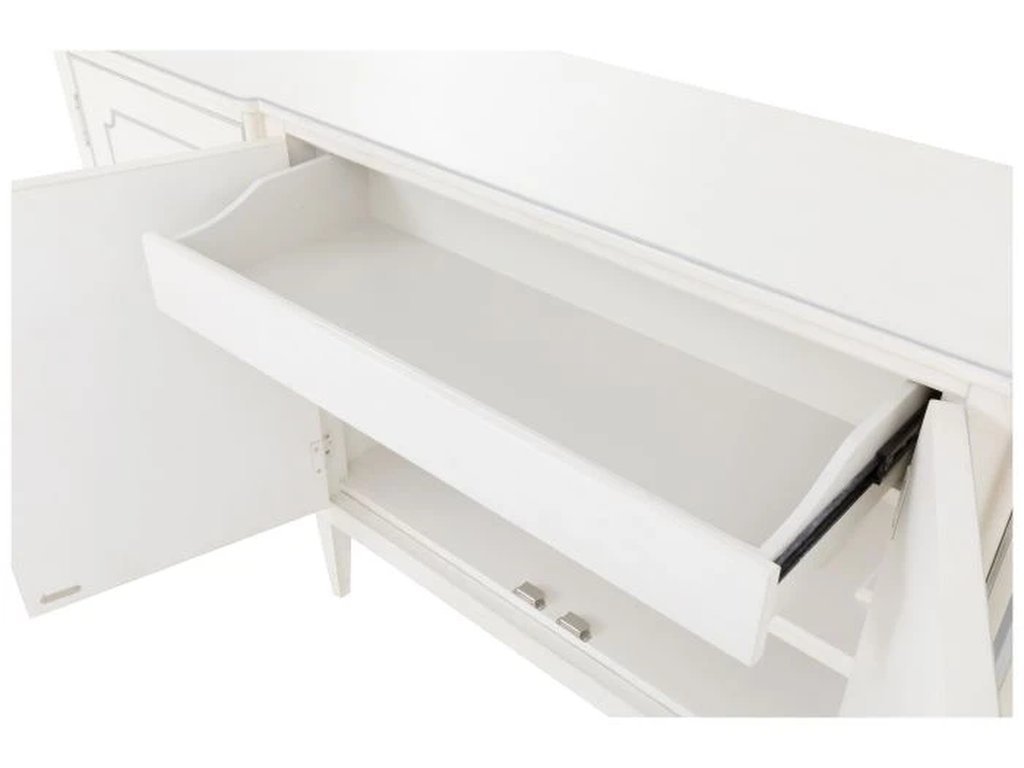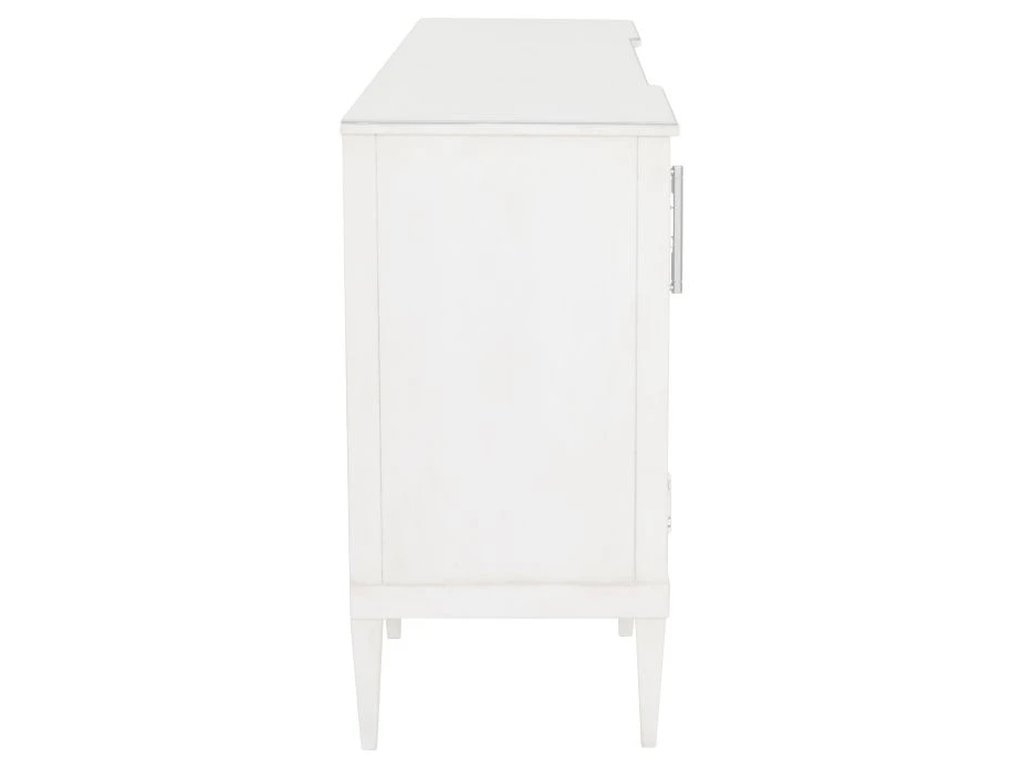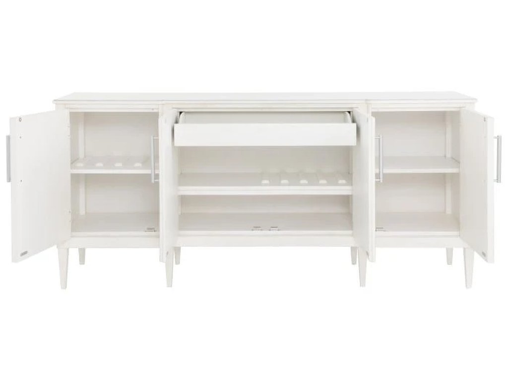 Including: a dining table extends from 77" to 121" wide, a marble-topped bar cabinet with one interior drawer and reversible shelf with wine storage, and a credenza with four drawers, one center drawer and adjustable shelves. Camille is stocked Linen or available in 40+ additional custom finishes via our Monogram Program.