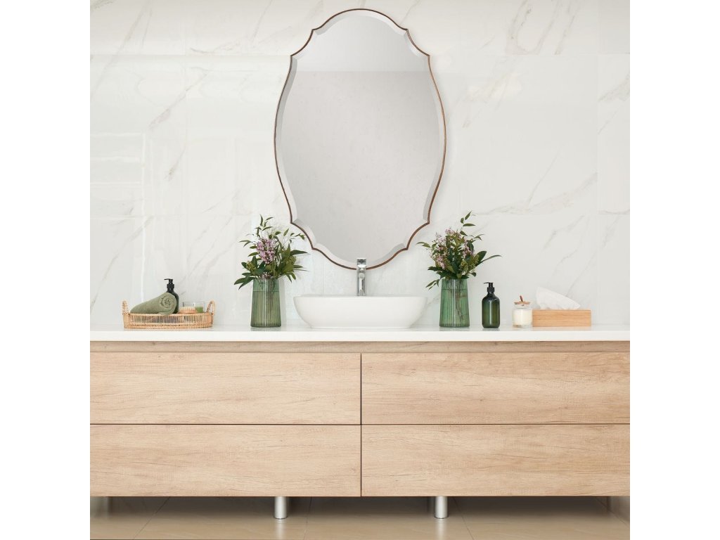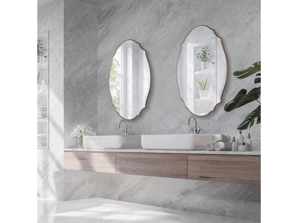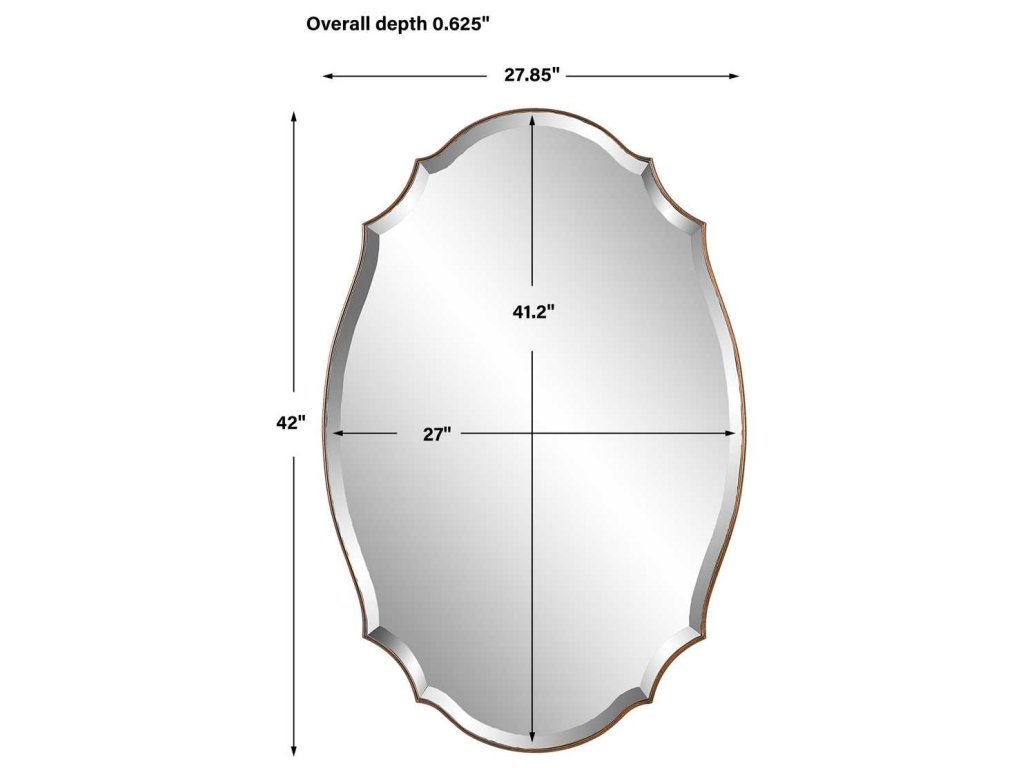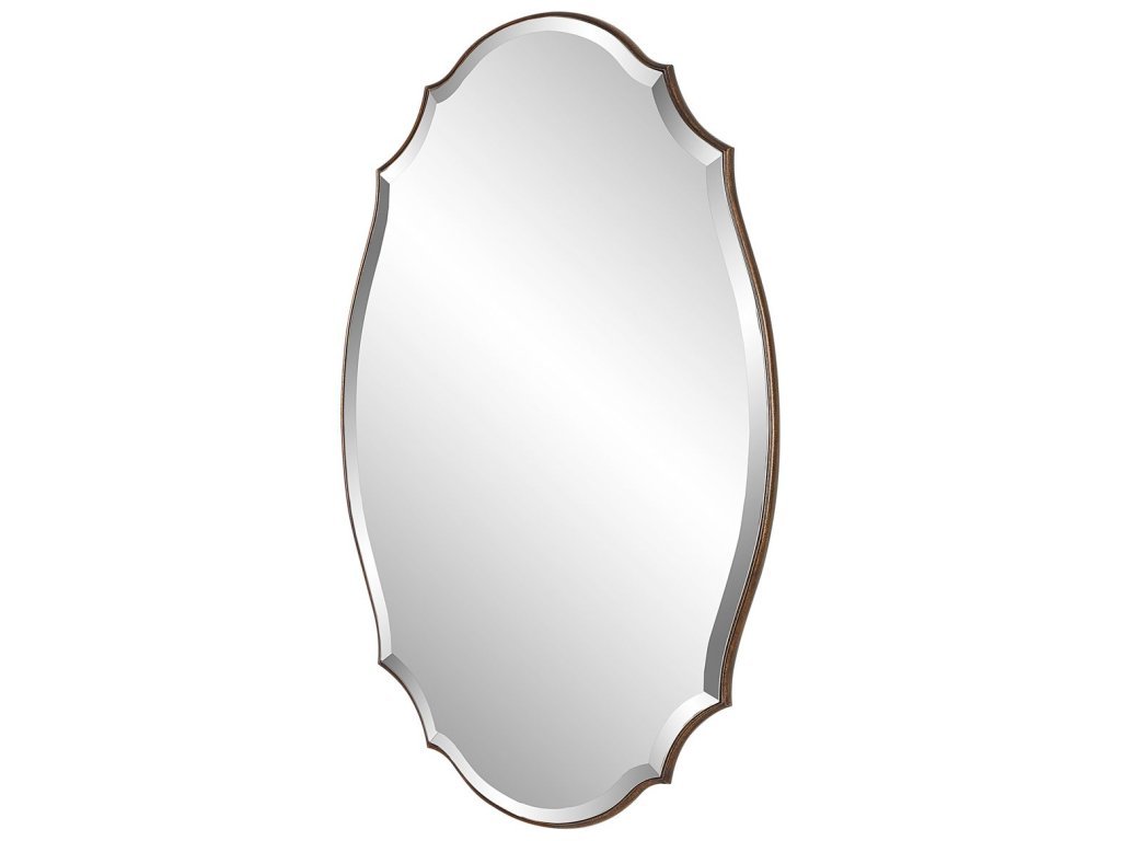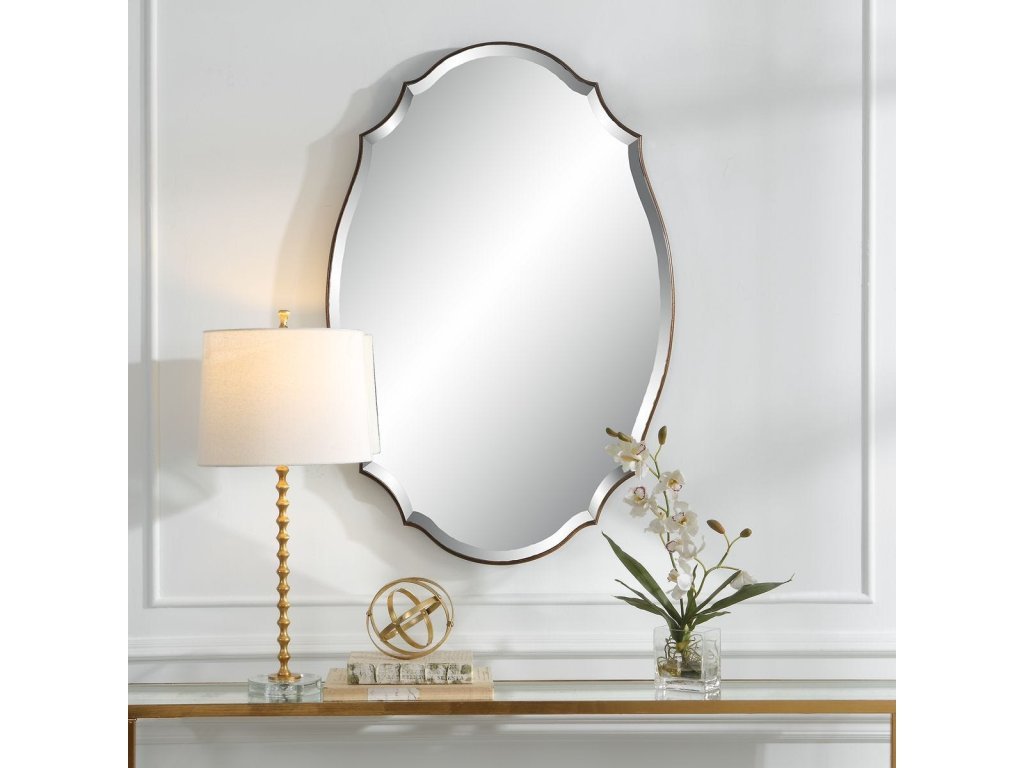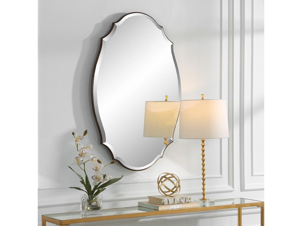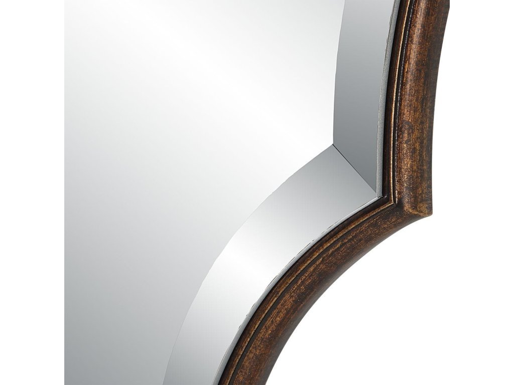 Product Description A shaped beveled mirror sits atop a rounded edged frame, finished in an antique bronze and gold finish. The bevel is 1". May be hung either vertically or horizontally.