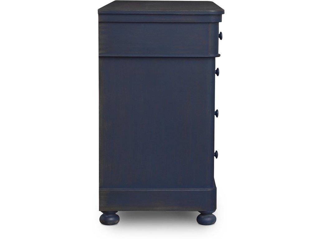 Product Description: The Dorchester Accent Chest helps create a personal style statement for any room with its traditional design and timeless details. Wood knobs draw your attention to the classic styling expressed in gently rounded-off edges, turned bun feet, and fluting that emphasizes the top drawer. Store your clothing, linens, or any manner of sundries in the soft-close drawers. Opt for the finish that enhances the personality of your space -- a gently distressed Lagoon or Adriatic Blue or solid Porcelain white.